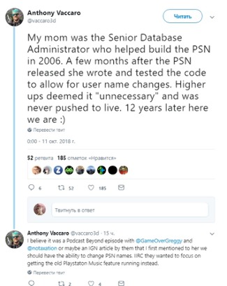 «Моя мама была старшим администратором базы данных, которая отвечала за создание PlayStation Network в 2006 году. Через несколько месяцев после начала работы сервиса она написала и протестировала код, позволяющий изменять ник. Высшее руководство посчитало его «ненужным» и отправило в мусорку. 12 лет спустя возможность реализовали».